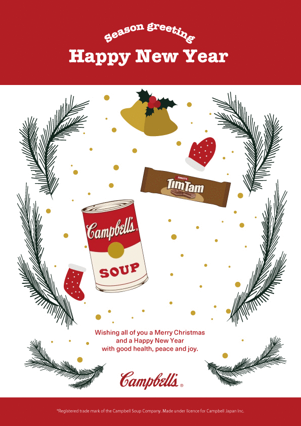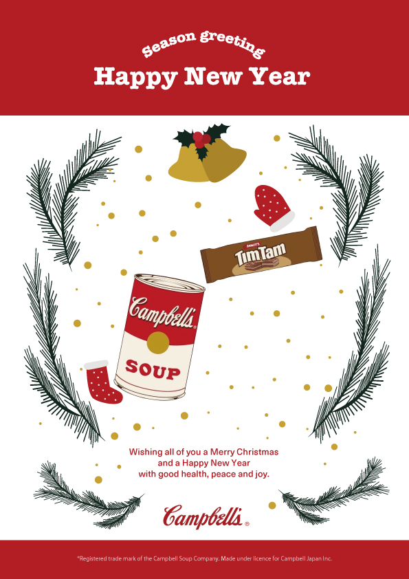 We have created a season greeting for Campbell Japan, which handles food products mainly in Australia and New Zealand, and imports and sells them. We designed a greeting card with a pop impression that can be used from Christmas to New Year.