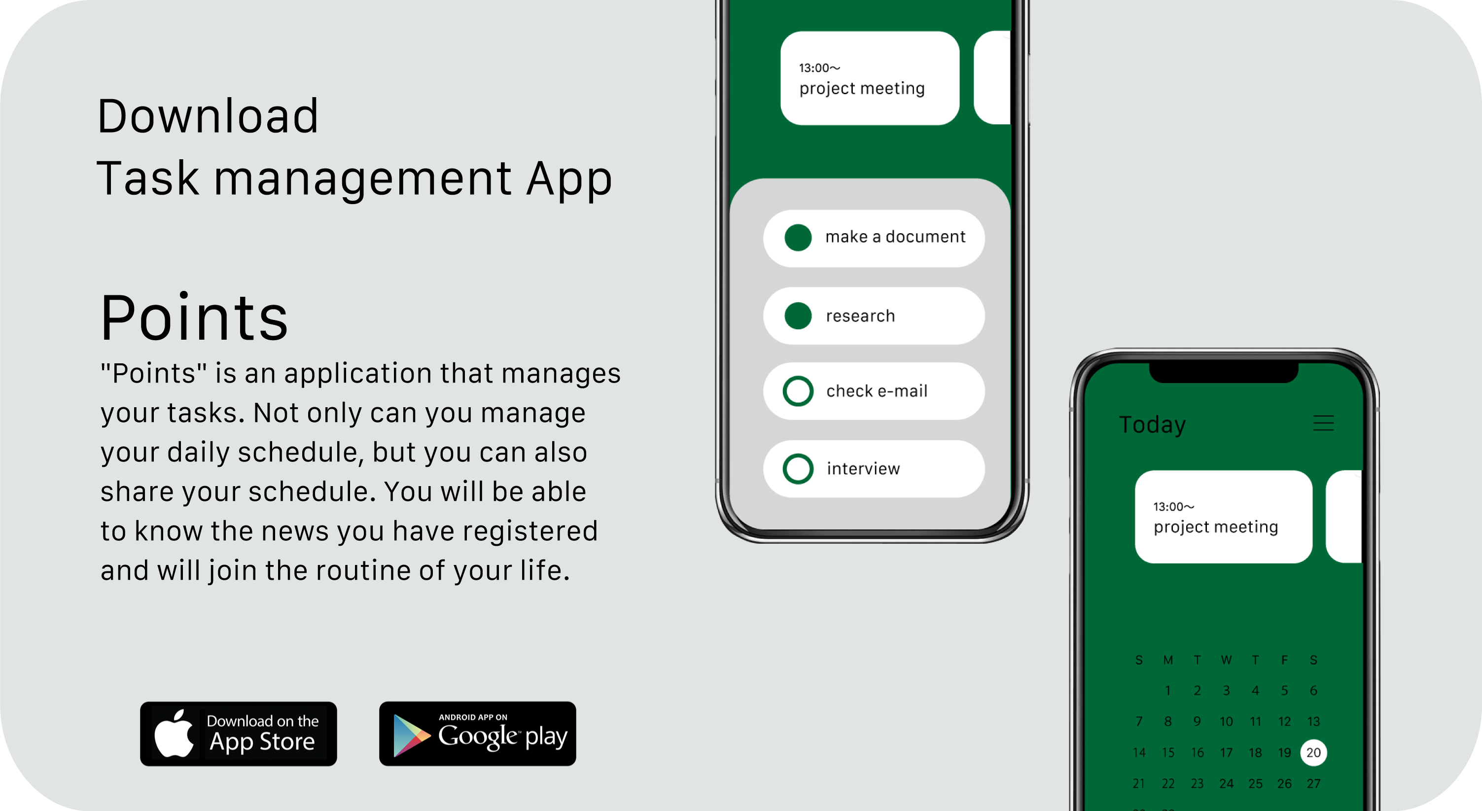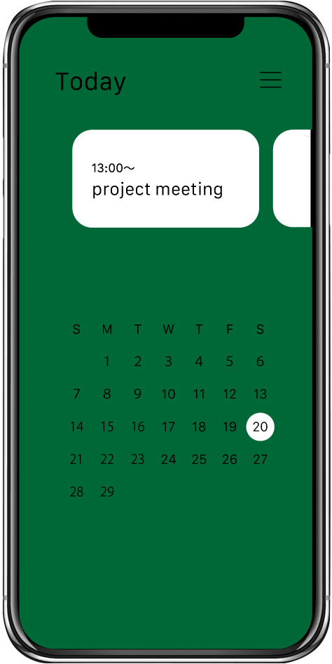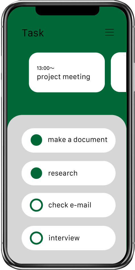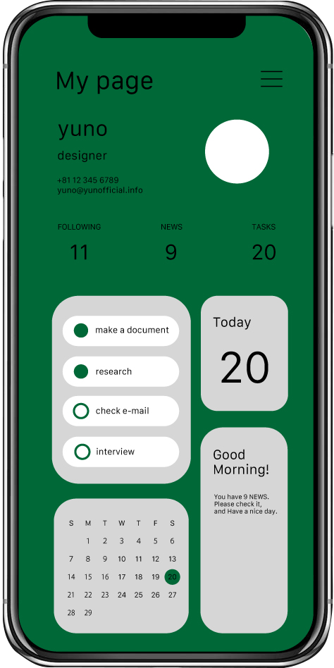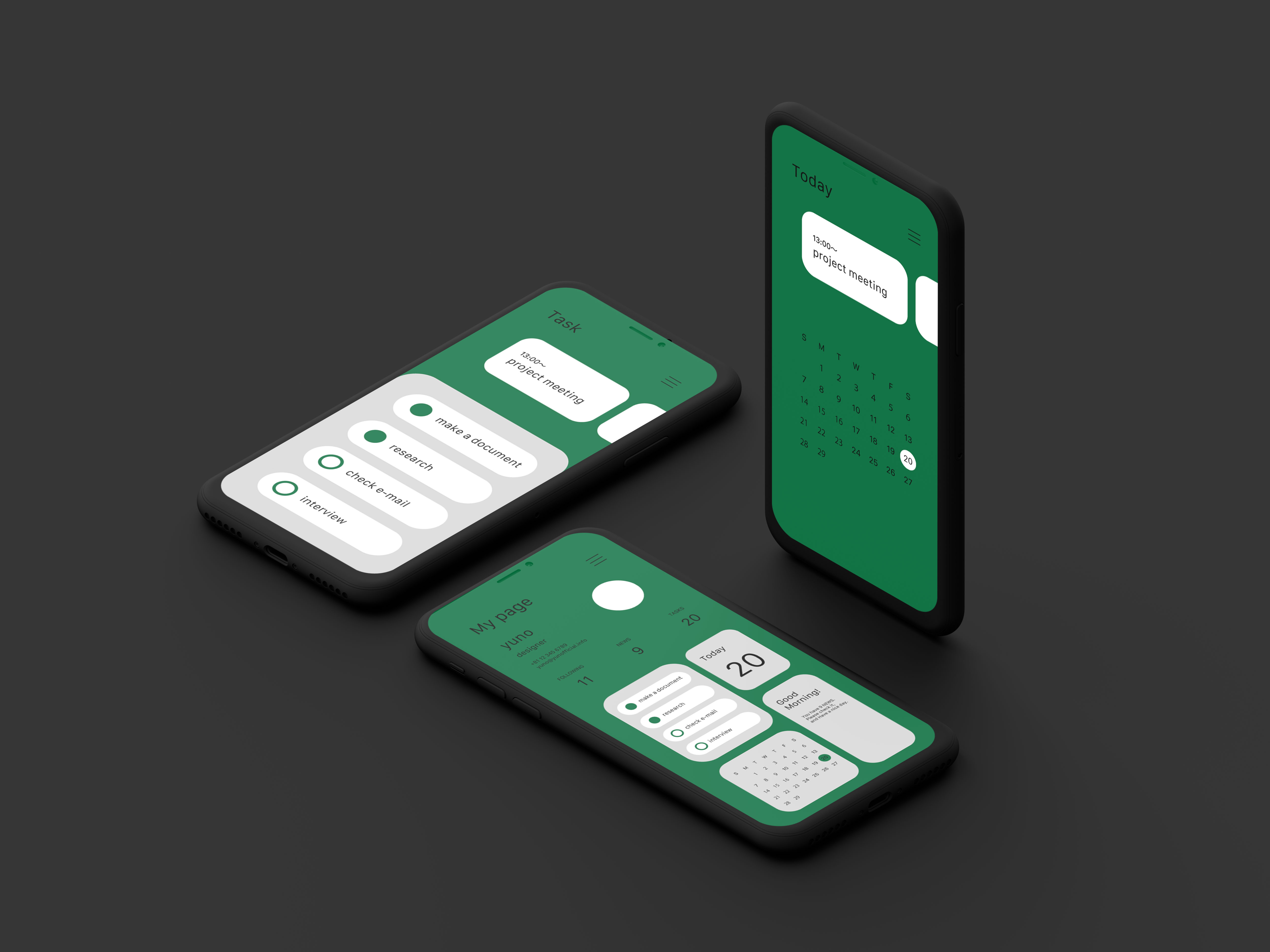 1日のスケジュール管理はもちろん、スケジュールのシェアリングなどといった複数機能が備わっているアプリを想定して制作。登録しているニュースを知ることができるので、普段の生活のルーティンに馴染むよう考えました。